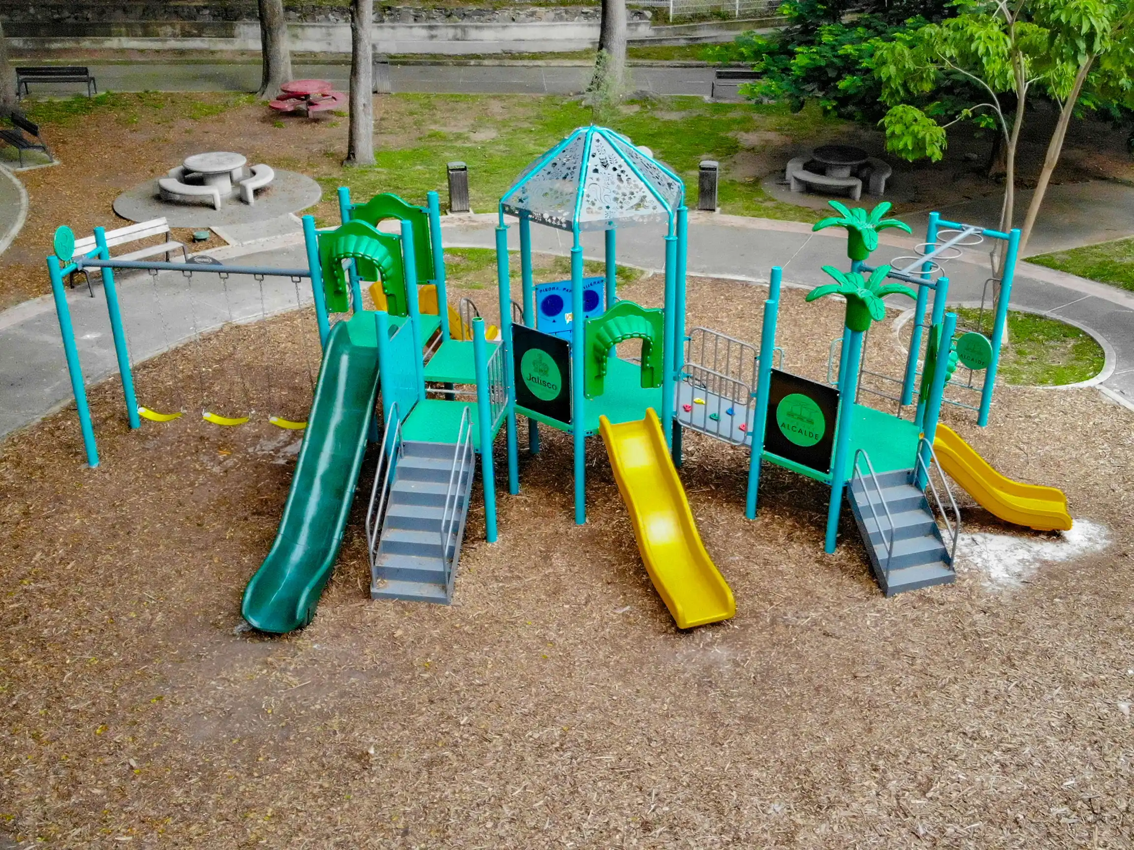 Nuestros conjuntos integran toboganes, resbaladillas, pasamanos y puentes que fomentan el trabajo en equipo, la coordinación y la aventura.